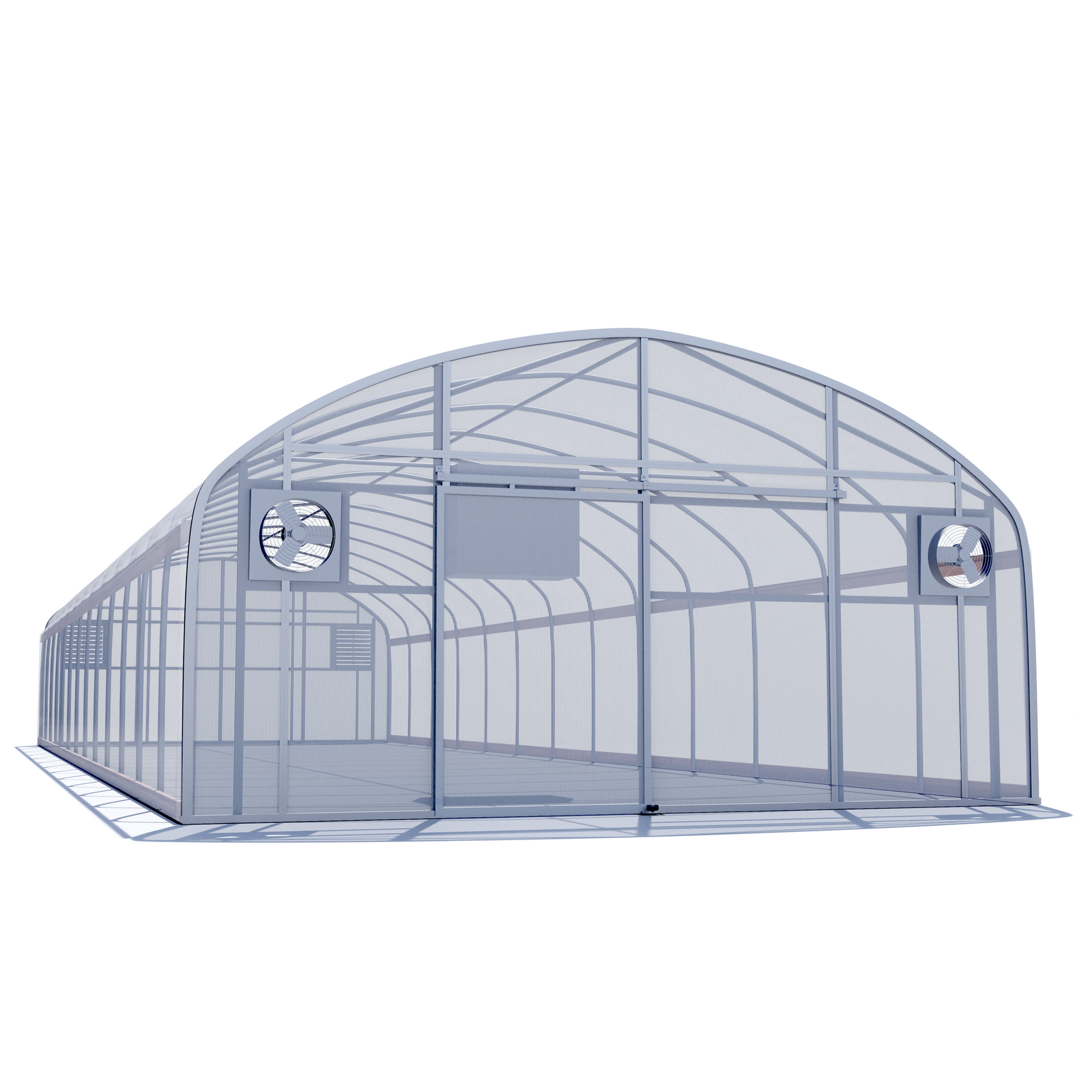 Aluminum intake shutters automatically open when exhaust fans turn on to allow fresh air into the greenhouse.