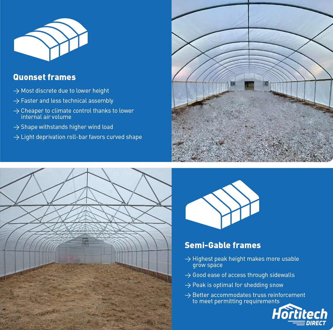 Quonset shaped greenhouses use less materials than semi gable designs and are best used in mild climates with little to no snow load requirements. They have less air volume making ventilation and climate control less expensive.